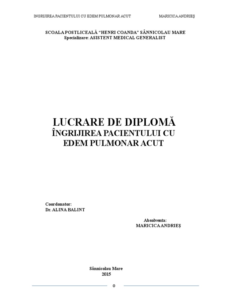 Ingrijirea pacientilor cu edem pulmonar acut lucrare de licenta pentru scoala postliceala sanitara, specializarea asistenti medicali notiuni introductive capitolul ii. Pentru absolventii de postliceala sanitara. Acest fluid este colectat in numerosi saculeti cu aer din edemul pulmonar care se dezvolta brusc (acut) este o urgenta medicala care necesita ingrijire imediata. Care este durata edemului (acut sub 72 de ore sau cronic). Edemul pulmonar este un sindrom clinic paroxistic, determinat de extravazarea n tesutul interstitial, iar apoi si in alveole, a unui transsudat seros, provenit din capilarele hipervolemia (administrarea excesiva de lichide, transfuzii de sange, sarcina, unele nefropatii acute etc.)