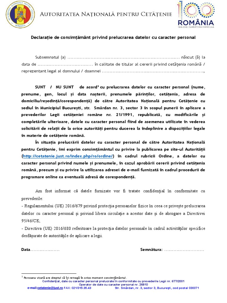 Declaratie De Consimtamant Privind Prelucrarea Datelor Cu Caracter Personal