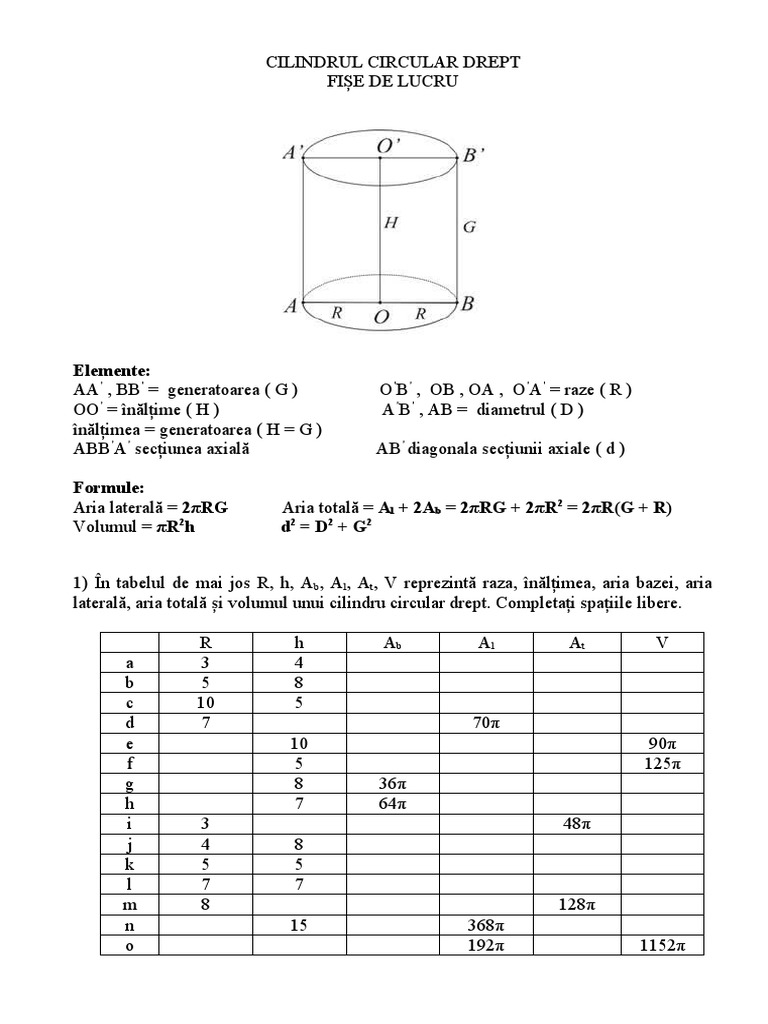 vizitati articolul complet aici : https://www.butlercarriers.com/formula-volum-cilindru Axa de simetrie a cilindrului este oo'. 3) secțiunea axială a unui con circular drept este un triunghi echilateral de latură 6√3 cm. Cel mai simplu cilindru este o figură formată prin rotirea unui dreptunghi în jurul unei laturi.