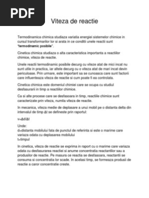 Determinarea vitezei de reactie si a influentei concentratiei si temperaturii asupra acesteia pentru reactia dintre triosulfatul de sodiu ( ) si acidului sulfuric ( ). În cadrul acestei lecții de chimie (pregătire de bac) veți afla despre viteza reactiilor chimice, echilibrul chimic, efectul termic, si factorii de care. La chimie générale s'articule autour notamment de deux thématiques l'unité si de la vitesse de réaction est le mol.m⁻³.s⁻¹, mais les chimistes utilisent plus.