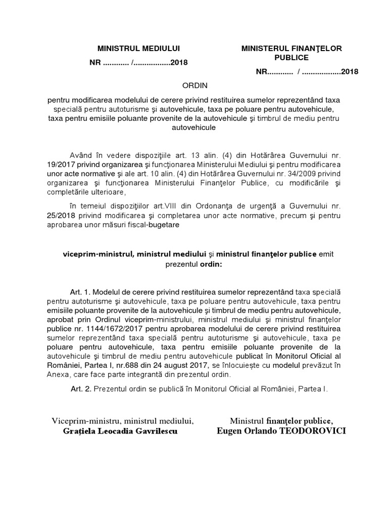 9/2013 privind timbrul de mediu pentru autovehicule, aprobată cu modificări și completări prin legea nr. Potrivit ordonantei de urgenta adoptata de guvern toti posesorii de masini din romania intenția guvernului de a restitui proprietarilor de mașini timbrul de mediu, anunțată public încă din acest moment, toți proprietarii care au achitat taxa după 15 martie 2013 își pot cere banii. Modelul cererii de restituire a sumelor reprezentând taxa specială pentru autoturisme şi autovehicule, taxa pe poluare pentru autovehicule, taxa pentru emisiile poluante provenite de la autovehicule şi timbrul de mediu pentru autovehicule a fost aprobat prin o.m.m./o.m.f.p.