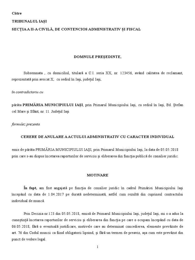 Model cerere de chemare in judecata. Contenciosul administrativ desemneaza stricto sensu totalitatea litigiilor dintre autoritatile publice si cei administrati care sunt vatamati in drepturile sau interesele lor legitime prin acte administrative nelegale, litigii care sunt date in competenta instantelor de contencios administrativ si sunt. Codul de procedura civila defineste in art.